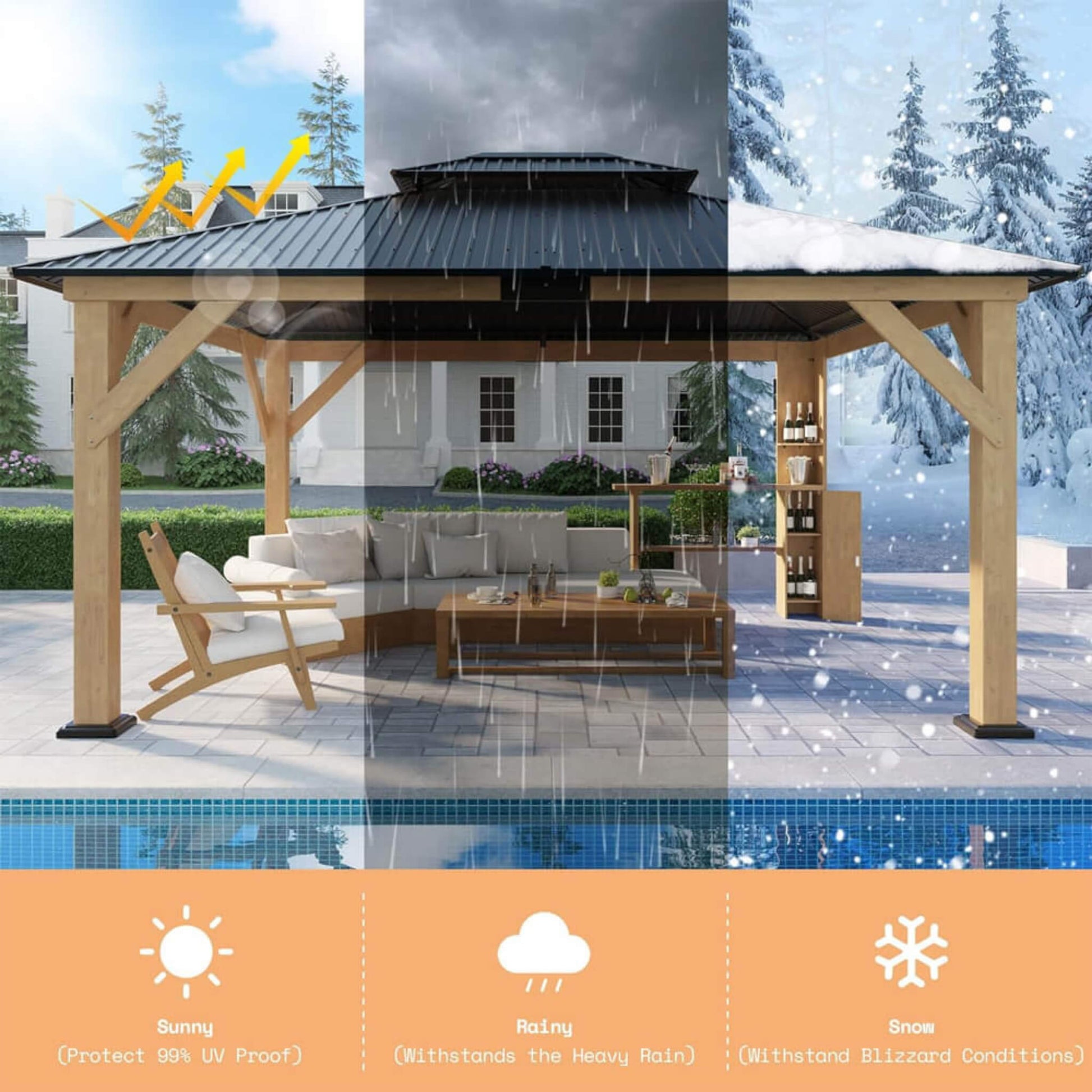 - No need to worry about inclement weather. Our hardtop gazebo has passed rigorous salt spray tests, ensuring all hardware is resistant to harsh conditions. Enjoy peace of mind knowing your gazebo will stand strong against wind and rain, providing a safe haven year-round.
