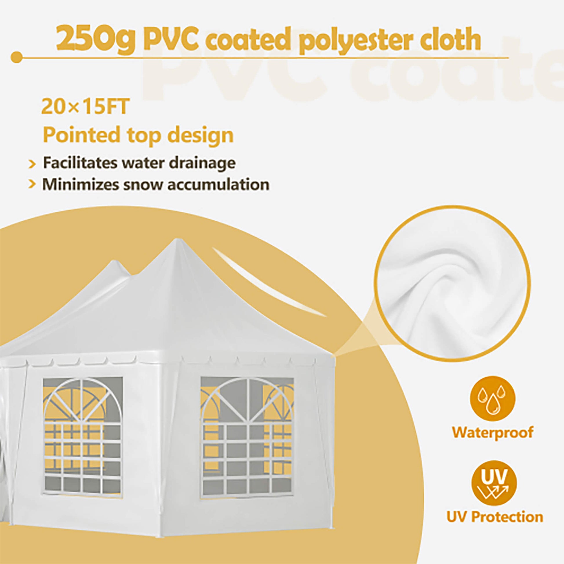 - With a 250g PVC coated polyester cloth canopy, our wedding tent offers Waterproof,UV Protection,resistance for repeat use.