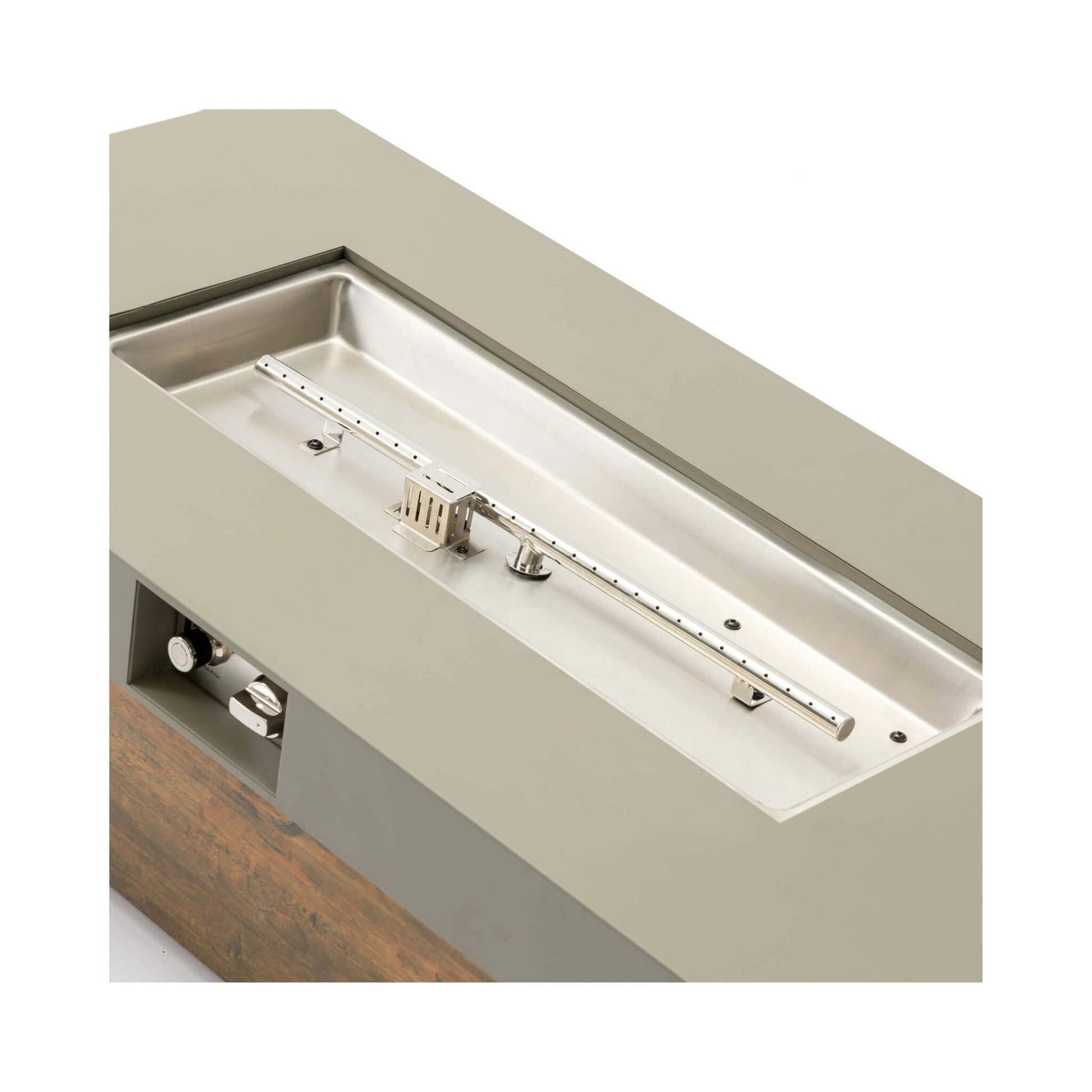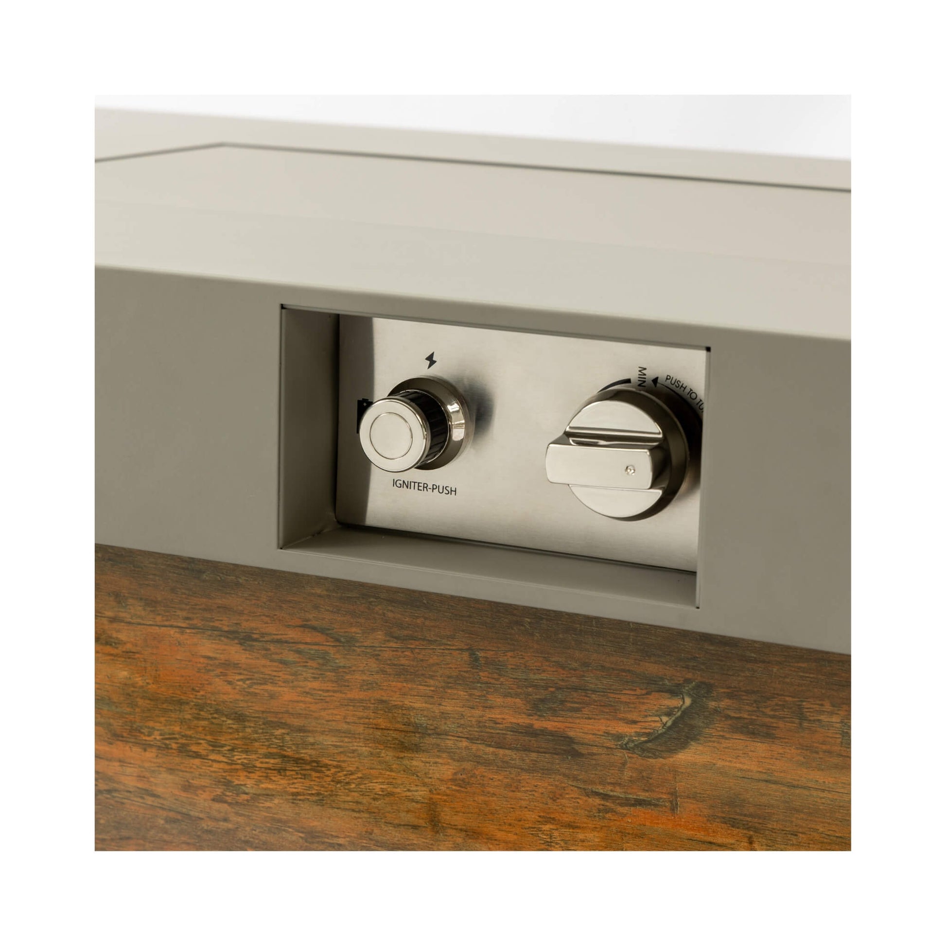 - Getting the fire started is effortless and secure! Just push the button and turn the knob for instant, adjustable flames. Built with a premium stainless steel burner and a wood grain finish, this fire table is designed for lasting elegance and low maintenance.