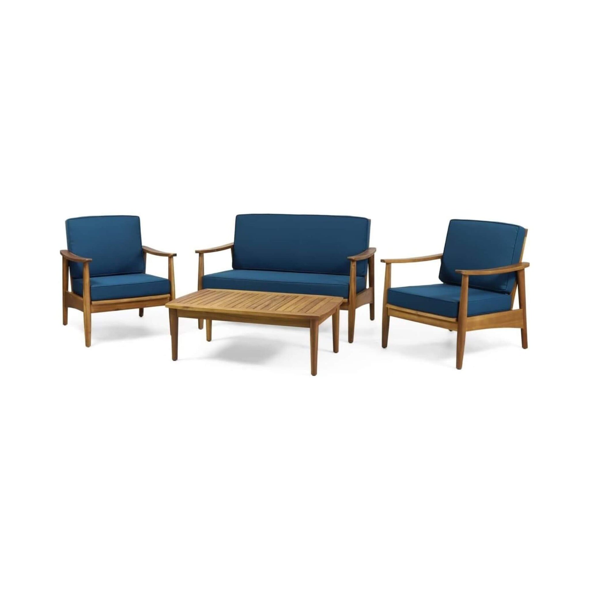 - This 4-piece wooden patio set features tapered legs and slatted details for a stylish, timeless look. Cushions add comfort, making it perfect for relaxing outdoors.
