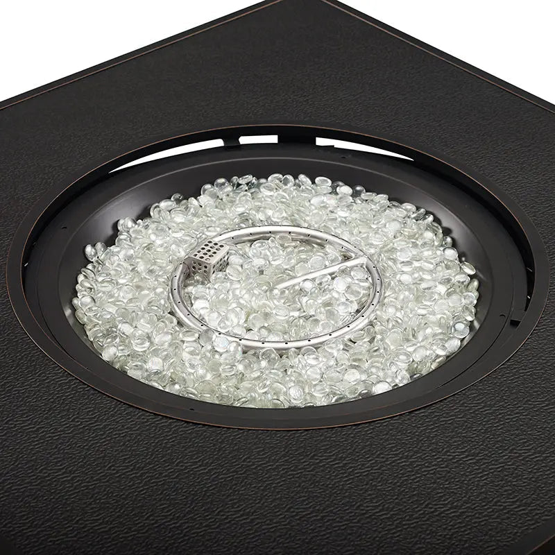 Dalton 40" Square Woven Aluminum: Compatible with any contemporary or traditional outdoor décor, Dalton 40" Square Woven Aluminum Convertible Gas Fire Pit Table, features a basketweave motif and round base. With an Antique Bronze brushed finish, practical aluminum build, and an output of 55,000 BTUs, this versatile fire pit pulls double duty as a patio table when you add the included fire bowl lid with flush-mounted handle. Arriving with clear fire glass for a stylish touch, just add a standard 20lb propane tank behind the convenient hinged door. A nylon cover for the fire pit is included for your convenience.