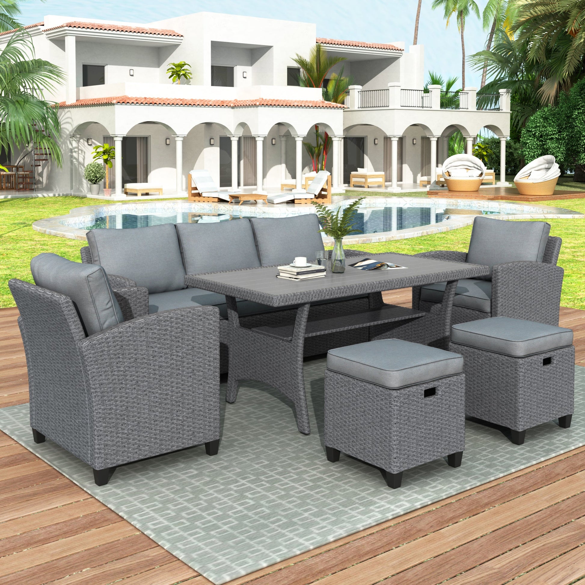 TOPMAX 6-piece outdoor rattan wicker set chair, stool, and table (gray rattan+gray mat)